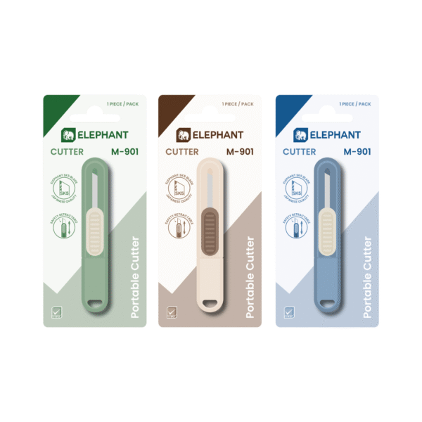 คัตเตอร์ขนาดเล็ก, ใบมีดทำจากเหล็กคาร์บอนสูง แข็งแรง ทนทาน, มีสปริงดึงใบมีดกลับ เพื่อป้องกันความปลอดภัย, มีที่ร้อยพวงกุญแจ พกพาสะดวก