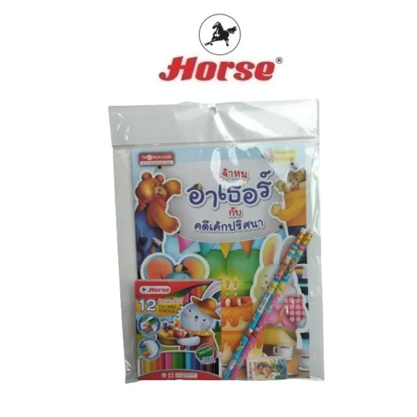 ชุดสมุดภาพระบายสีนิทานสำหรับเด็ก ประกอบด้วย สมุดนิทานระบายสี 1 เล่ม, ดินสอ HB 2 แท่ง, ดินสอสีไม้ 1 กล่อง และยางลบดินสอ 1 ก้อน