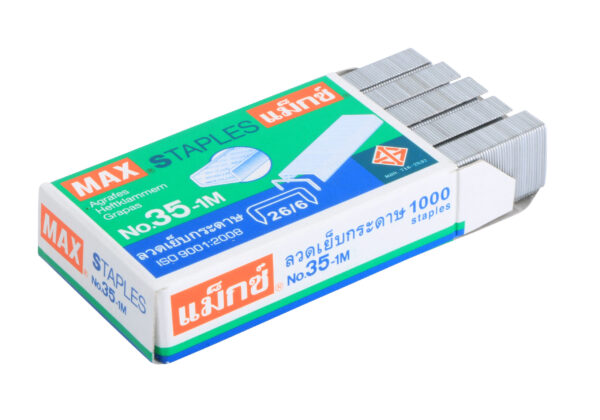 ลวดเย็บแม็กซ์ เบอร์10 ผลิตจากเส้นลวดที่มีคุณภาพสูง มีความแข็งแรง ไม่โค้งงอง่าย สามารถเย็บกระดาษได้สูงสุด 25 แผ่น (80 แกรม), ขนาดลวด (กว้างxยาว 11.5×6มม./ตัว) บรรจุ 1,000 ตัว/กล่อง