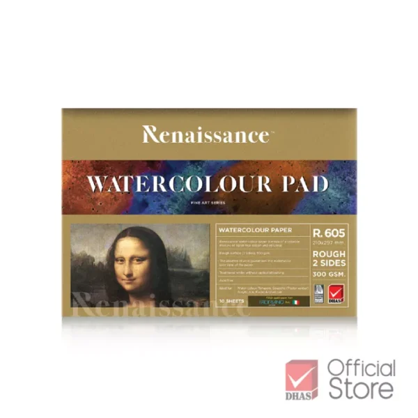 เนื้อกระดาษวาดเขียนสีน้ำ คุณภาพดี ซับน้ำได้ดี ผลิตในประเทศอิตาลี, เป็นเยื่อกระดาษชั้นดีแบบเยื่อใยขาว ทำให้การกระจายตัวของสีเป็นวงกว้าง, เป็นผิวหยาบทั้ง 2 หน้า ความหนา 300 แกรม, เหมาะสำหรับงานสีน้ำ และ สีโปสเตอร์, ขนาดสินค้า: 210×297 มม., มีจำนวน 10 แผ่น/เล่ม