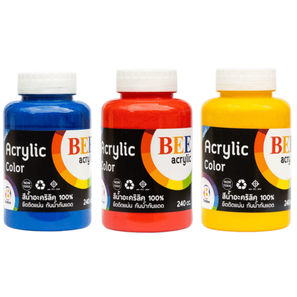 สีอะคริลิค ขนาด 240มล., ผลิตจากผงสีคุณภาพพิเศษ เม็ดสีละเอียดกว่าปกติ, สีสันสวยงาม, สามารถระบายได้เลย ไม่ต้องผสมน้ำ (ต้องการเจือจางสามารถผสมน้ำได้ไม่เกิน 10%), สีกันน้ำ กันแดด ทนต่อสภาพอากาศ ไม่ซีดจาง, ปราศจากสารพิษ ไม่เป็นอันตรายต่อสุขภาพ, ระบายได้หลากหลายพื้นผิว เช่น กระดาษ, เพ้นท์รองเท้า, โฟม, โลหะ, ไม้, กระจก, พลาสติกและอื่นๆ