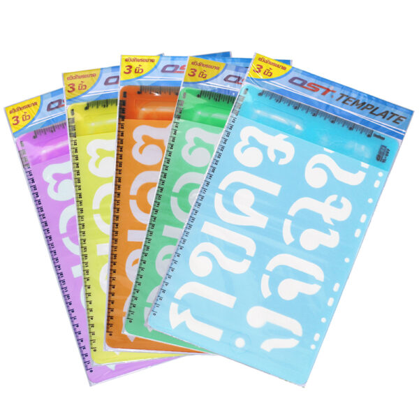ผลิตจากพลาสติกพีพีคุณภาพดี, น้ำหนักเบา แข็งแรง ทนทาน, ขอบแผ่นเทมเพลทเจาะ 11 รู เพื่อความสะดวกในการจัดเก็บ และ พกพา, ตัวฉลุเป็นตัวอักษรภาษาไทย, ใช้เป็นแม่แบบเขียนตัวอักษร หรือ แบบบล็อคพ่นสีป้าย สำหรับทำป้าย เขียนบอร์ดต่างๆ