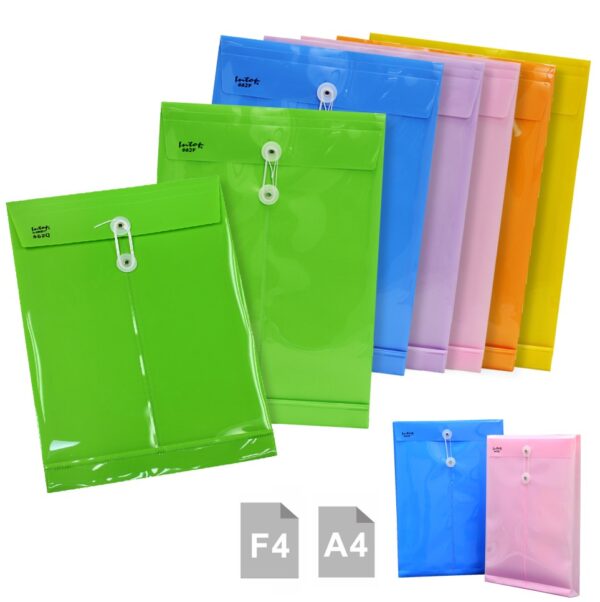 ซองพลาสติกผูกเชือก , ผลิตจากพลาสติกพีพี ฝาปิด เชือกคล้องพันรอบแป้นพลาสติก ป้องกันเอกสารและสิ่งของภายในซอง, เปิดใส่เอกสารทางแนวตั้ง ก้นซองขยายได้กว้าง 3 ซม. ใช้แทนซองกระดาษ พลาสติกทนทาน ไม่ฉีกขาดง่าย ทำความสะอาดได้ นำมาใช้ซ้ำได้บ่อยครั้ง