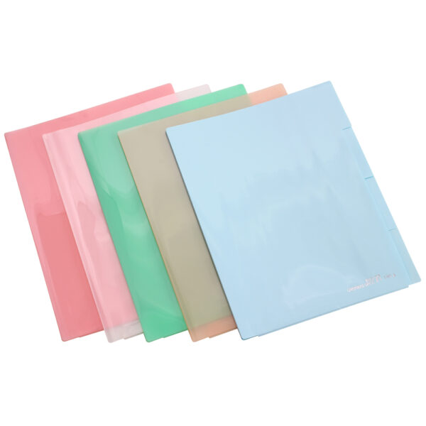 ผลิตจากพลาสติกพีพี หนา 200 ไมครอน (0.2 มม.), เป็นแฟ้มซ้อนกัน 2 ชั้น ใส่เอกสารได้ 3 ช่อง, มีสติ๊กเกอร์ติดที่หยัก สำหรับเขียนข้อความ