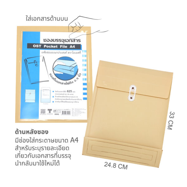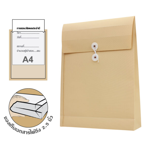 ผลิตจากพลาสติกพีพี หนา 300 ไมครอน (0.3 มม.) สีน้ำตาลอ่อน, หน้าซองมีช่องใส่เอกสารขนาด A4, มีฝาปิด เชือกคล้องพันรอบแป้นพลาสติก เพื่อป้องกันเอกสารและสิ่งของภายในซอง, สามารถเปิดใส่เอกสารทางด้านบนแนวตั้ง ใส่เอกสารได้ถึงขนาด A4, ด้านข้างและก้นซองขยายได้กว้าง 6.5 ซม.(2.5นิ้ว) ใส่เอกสารได้ จำนวนมาก ความหนา 80 แกรม ประมาณ 625 แผ่น