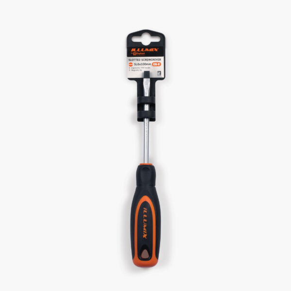 ไขควงหัวแบนเบอร์ 6 ขนาดยาว 100 มม., ผลิตจากโลหะ Chromium-vanadium มีความแข็งแรง ใช้งานได้ทนทาน, ด้ามจับยางมีขนาดใหญ่ ใช้งานได้สะดวก จับถนัดมือ, ปลายไขควงเป็นแบบแม่เหล็ก มีขนาดและประเภทของไขควงระบุที่ปลายด้าม