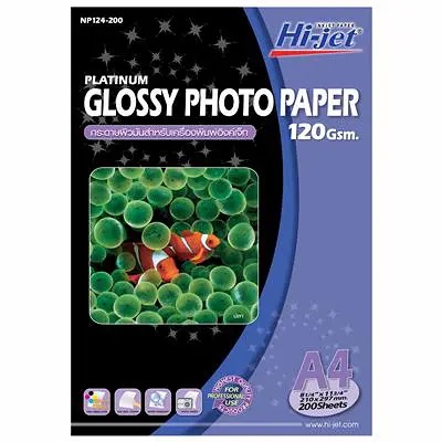กระดาษอิงค์เจ็ท ขนาด A4 ความหนา 120 แกรม เนื้อกระดาษสีขาว เคลือบน้ำยาพิเศษ ผิวมันเงา ใช้สำหรับงานพิมพ์ภาพถ่าย โฆษณา และ กราฟิกต่างๆ, รองรับความละเอียดได้สูง ดูดซับน้ำหมึกได้ดี และ น้ำหมึกแห้งเร็ว, กันน้ำได้ ภาพไม่เลือนหายแม้เวลาผ่านไปนาน, ใช้ได้กับเครื่องพิมพ์อิงค์เจ็ทได้ทุกยี่ห้อ, บรรจุ 200 แผ่น/กล่อง