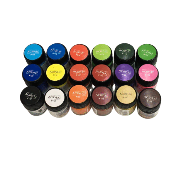 สีอะคริลิค ขนาด 15 มล. เป็นสีสูตรเข้มข้น, ผลิตจากอะคริลิคแท้ 100% กันน้ำได้ ไม่มีกลิ่นฉุน เมื่อระบายสีแห้งแล้วสีจะเงา, ใช้ทาได้หลากหลายพื้นผิว, สามารถใช้เพ้นท์เล็บได้ ไม่เป็นอันตราย