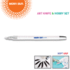 ตัวด้ามพลาสติกทำจากวัสดุ PVC ปลายด้าม มีช่องที่สามารถเก็บใบมีดได้, สามารถพกพาสะดวก ขนาดกระทัดรัด, เหมาะสำหรับตัดแต่งทำงานประดิษฐ์หรืองานศิลปะ เป็นต้น