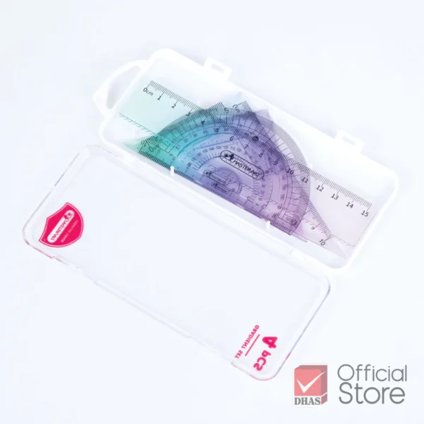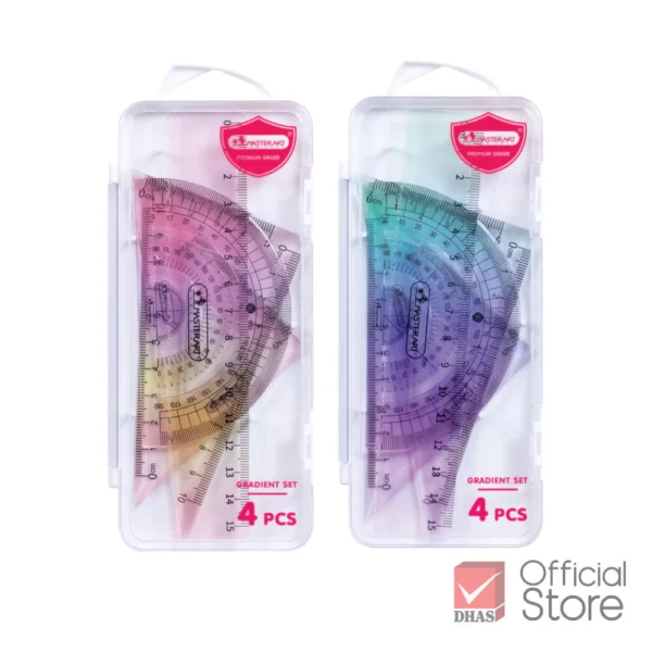 ชุดเรขาคณิต สีสวย โทนพาสเทลไล่เฉด, ผลิตจากวัสดุคุณภาพดี บรรจุในกล่องพลาสติกแข็งแรง, สามารถใช้วัดระยะได้อย่างแม่นยำ, 1 กล่อง ประกอบด้วยอุปกรณ์ 4 ชิ้น ได้แก่ ไม้บรรทัด 15 ซม., ไม้ครึ่งวงกลม 180 องศา, ไม้ฉากสามเหลี่ยม 45 องศา, ไม้ฉากสามเหลี่ยม 60 องศา