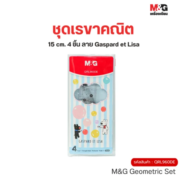 ชุดเรขาคณิต ลายน่ารัก, ผลิตจากวัสดุคุณภาพดี บรรจุในซองพลาสติก, สามารถใช้วัดระยะได้อย่างแม่นยำ, 1 ชุด ประกอบด้วยอุปกรณ์ 4 ชิ้น ได้แก่ ไม้บรรทัด 15 ซม., ไม้ครึ่งวงกลม 180 องศา, ไม้ฉากสามเหลี่ยม 45 องศา, ไม้ฉากสามเหลี่ยม 60 องศา
