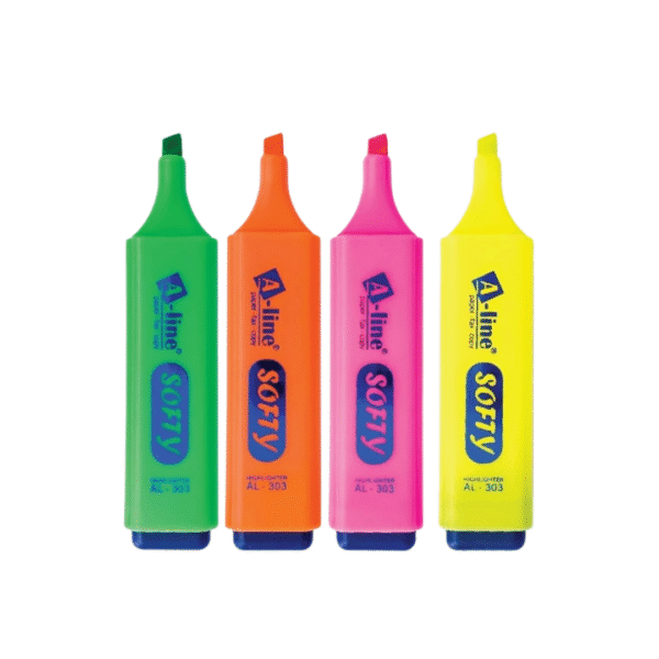 ปากกาเน้นข้อความ รุ่น AL-303 Softy หัวตัด, สีสันสดใส เขียนลื่น เส้นต่อเนื่องและคมชัด แห้งเร็ว, ใช้ได้นาน ไร้กลิ่นฉุน, ไม่เกิดรอยดำ เมื่อนำไปถ่ายเอกสารหรือส่งแฟกซ์