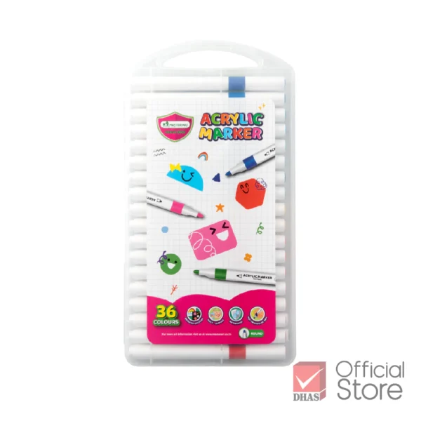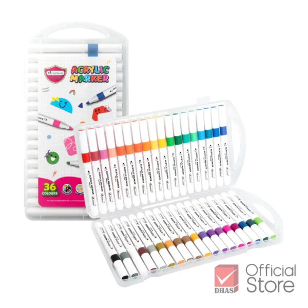 ปากกาอะคริลิคมาร์กเกอร์ สีสันสดใส เฉดสีคมชัด ระบายง่าย, หัวปากกาแบบกลม ขนาด 4 มม., ด้ามสามเหลี่ยม จับถนัดมือ แห้งเร็ว ไม่เลอะง่าย กันน้ำได้ดี, ใช้งานได้หลากหลายพื้นผิว เช่น กระดาษ ไม้ พลาสติก แก้ว และ ผ้า, เหมาะสำหรับงาน DIY และ กิจกรรมศิลปะ