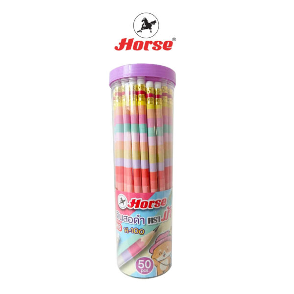 ดินสอดำ HB แบบเหลาพร้อมใช้งาน, ตัวด้ามมีหลายสี สีสันสดใส, ด้ามไม้เนื้ออ่อนเหลาง่าย ไม่เป็นขุย ไส้ไม่เปราะง่าย เขียนได้นุ่มและลื่น, ด้ามจับทรงหกเหลี่ยม จับถนัดมือ มียางลบที่ปลายด้าม, บรรจุ 50 แท่ง/กระปุก