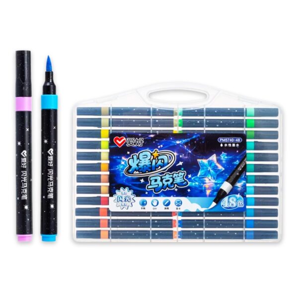 ปากกามาร์กเกอร์อะคริลิคมีกากเพชร, ปากกาหัวพู่กัน, น้ำหมึกคุณภาพดี หัวไม่แตกง่าย, มี 2 เฉดสีในด้ามเดียว, ใช้สำหรับเขียนบนวัสดุกระดาษ เขียนข้อความ และ วาดเขียนงานศิลปะได้