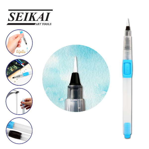 พู่กันแท็งค์กลม, ตัวขนพู่กันเป็นขนไนลอน ปลายกระบอกสำหรับใส่น้ำ, เหมาะสำหรับดินสอสีระบายน้ำ ช่วยให้สะดวกต่อการใช้งานและพกพา