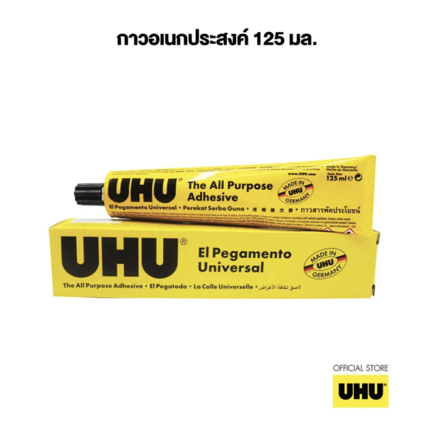 ผลิตและนำเข้าจากประเทศเยอรมนี, เนื้อกาวสีใส ติดแน่น แห้งเร็ว, เช็ดถูคราบกาวออกได้ง่าย, สำหรับงานอเนกประสงค์ทั่วไป เช่น งานกระดาษ ผ้า ไม้ กระเบื้อง แก้ว เป็นต้น, ปริมาณสุทธิ 125 มล./หลอด