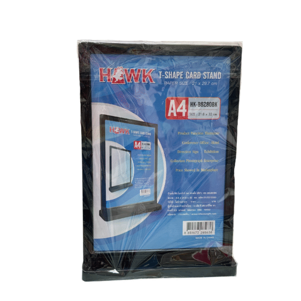 ป้ายโบรชัวร์แนวตั้ง ขนาด A4, ผลิตจากพลาสติกเนื้อดี มีความแข็งแรง ทนทาน, เนื้อพลาสติกโปร่งใส มีขอบสีดำด้านนอก, ฐานวางมั่นคงและแข็งแรง, แท่นสำหรับตั้งโต๊ะ เป็นรูปทรง T-SHAPE, เหมาะสำหรับสอดป้ายชื่อ ข้อความ เอกสาร หรือรูปภาพต่างๆ